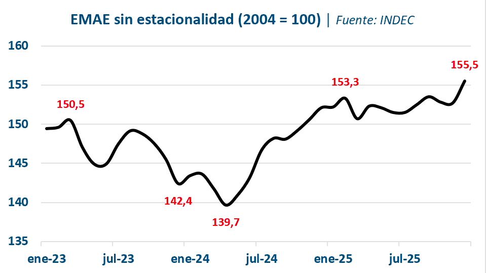 En cuanto a la actividad, el estimador mensual de actividad económica (EMAE) de diciembre de 2025 registró un aumento interanual de 3,5%. En términos desestacionalizados, el índice creció 1,8% respecto de noviembre. En la comparación interanual, once sectores mostraron aumentos. Se destacó Agricultura, ganadería, caza y silvicultura (32,2%), impulsado por una producción histórica de trigo, tanto en volumen (máximo de la serie) como en rinde promedio (50% por encima de las últimas cinco campañas).