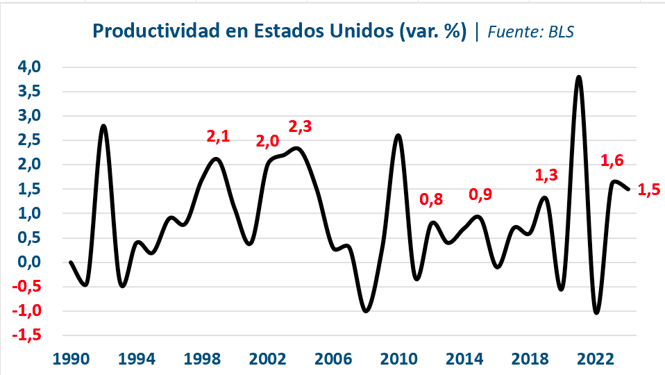 ¿Pero qué evidencia tenemos ahora? La evidencia sobre aumentos en la eficiencia y la productividad es, hasta aquí, fundamentalmente micro: corresponde a estudios realizados en sectores específicos y tipos de tareas. Pero a nivel macroeconómico, que es lo realmente relevante, no hay mucho por mostrar. El indicador clave a seguir es la productividad total, porque su crecimiento mide la tasa a la que puede expandirse el PIB más allá de lo explicado por el trabajo y el capital. En Estados Unidos la productividad creció a tasas superiores al 2% con el boom de internet, pero luego cayó hasta un decepcionante promedio del 0,6% entre 2011 y 2019. Los datos de 2023 y 2024 son algo más auspiciosos y algunas estimaciones sugieren una tasa muy cercana al 2% en 2025. ¿Esto se debe a la IA? Aún es difícil saberlo con certeza.