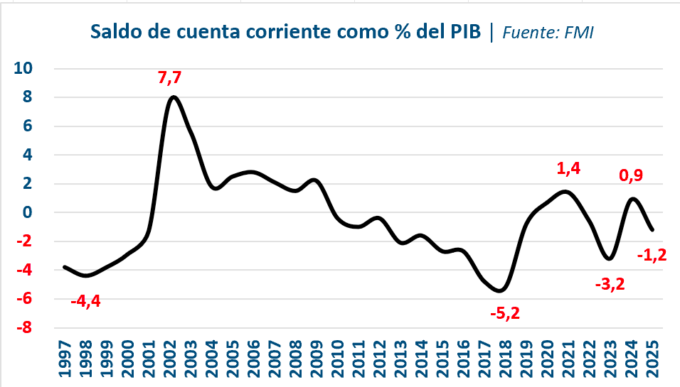 y muy lejos del período 2003–2008, cuando un tipo de cambio real alto coexistió con crecimiento sostenido. El FMI estima que la cuenta corriente registró un déficit del 1,2% del PIB en 2025.
