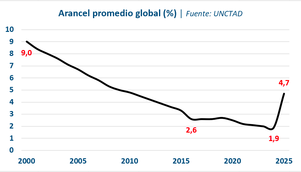 logrando un aumento del 7% en relación con Esto demuestra que la estructura de una economía global superconectada ha prevalecido sobre las políticas domésticas proteccionistas. Desde una perspectiva histórica, la tendencia es clara. En los últimos 20 años, el arancel promedio global ha mostrado una reducción significativa, facilitando la integración de economías emergentes. El arancel promedio global aplicado, que se situaba en niveles cercanos al 9% a finales de los años 90 a descendido a 1.9% en 2024 para luego aumentar a 4,7% en 2025 debido a las fricciones entre potencias el año pasado. Es importante mantener una visión de largo plazo y evaluar que las iniciativas defensivas observadas por la administración del presidente Trump, y contrarrestadas recientemente por la Corte Suprema de Estados Unidos, es más una excepción que una norma.